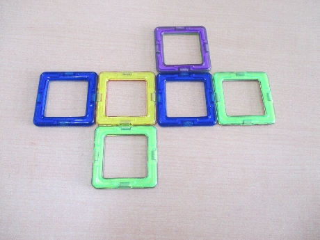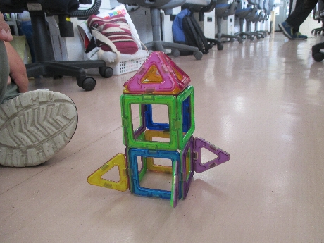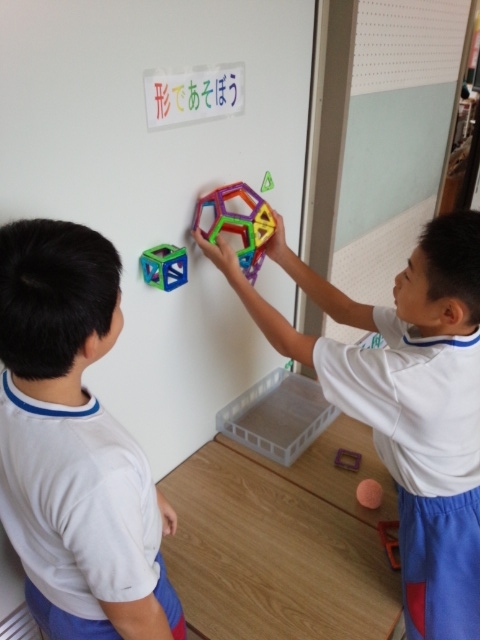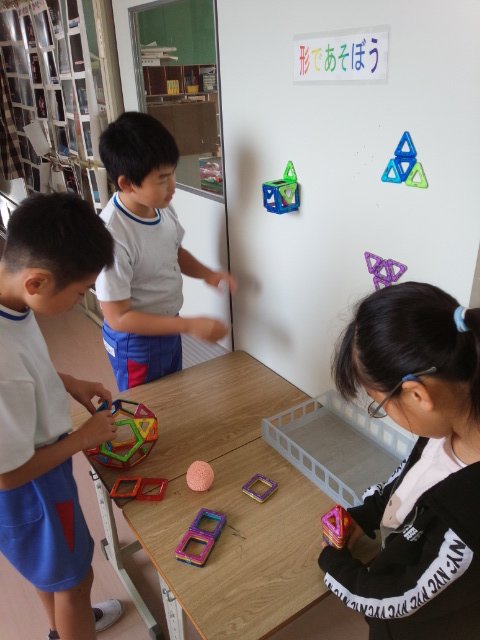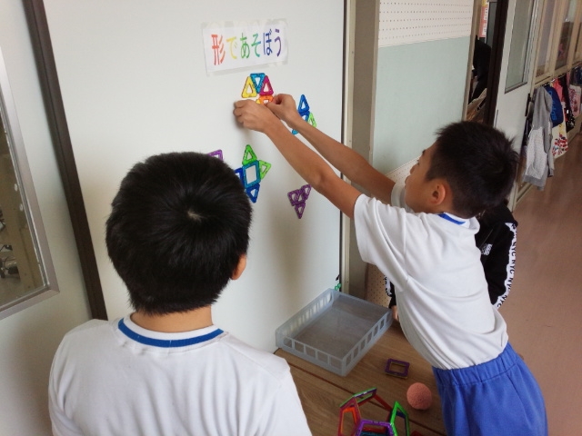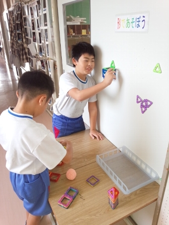 先日の研究会のおりにおいでくださった稲垣先生から「マグ・フォーマー」という数学のセンスを育む図形遊びのできる教材を寄付していただきました。正方形や正三角形の形をした磁石で互いを付けることのできるもので、組み合わせることによりいろいろな平面図形や立体、その展開図などを手軽に遊びながら体験できるものです。さっそく算数コーナーにおいて自由に体験できるようにしたところ、多くの子ども達が興味深そうに触っていました。やらされるのではなく、自主的に体験することから得た知識はいつまでも頭に残るはずです。今後もたくさん活動させていきたいと思います。稲垣先生、ありがとうございました。