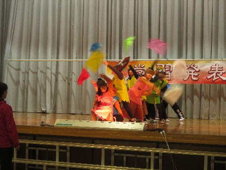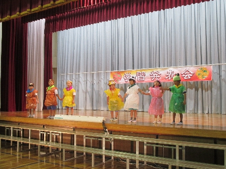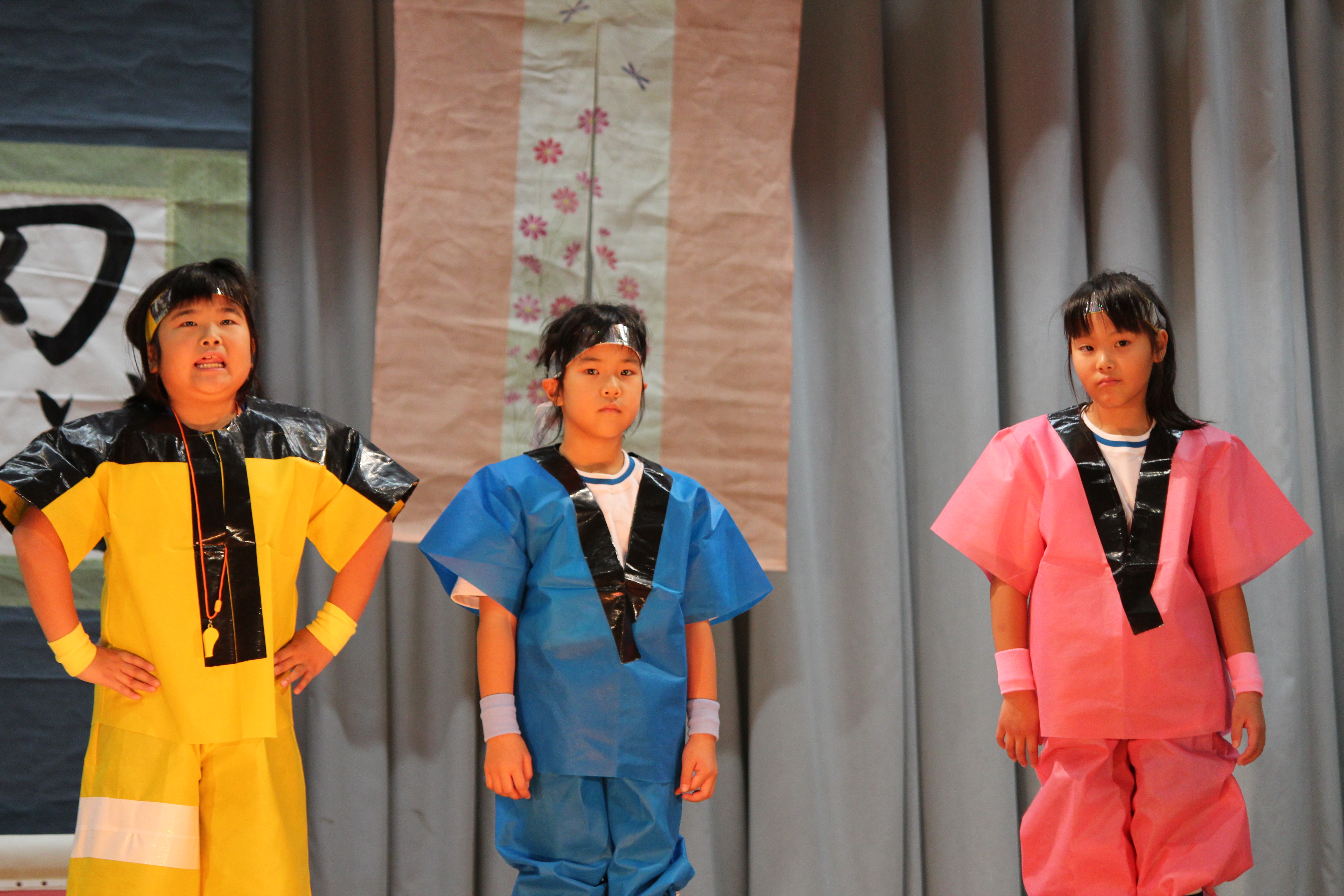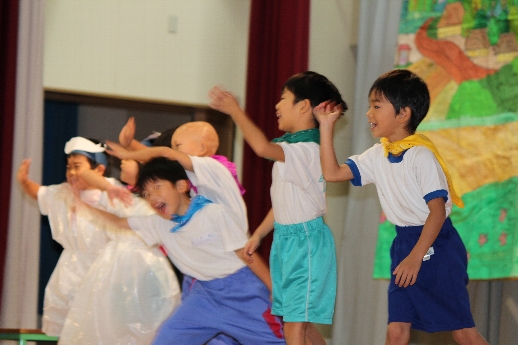 元気いっぱいの1年生7名は開幕の言葉を任されました。トップバッターという緊張する中でも元気一杯踊り、セリフを言うことができました。この元気な姿が発表会全体の成功を導いてくれたと言っても過言ではありませんでした。くじらぐもでも、元気一杯に、踊り、セリフを言いました。教科書の話だけではなく、自分たちで考えた場面もあって素晴らしい劇になりました。