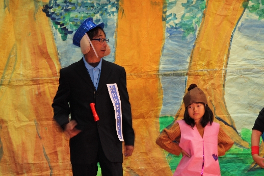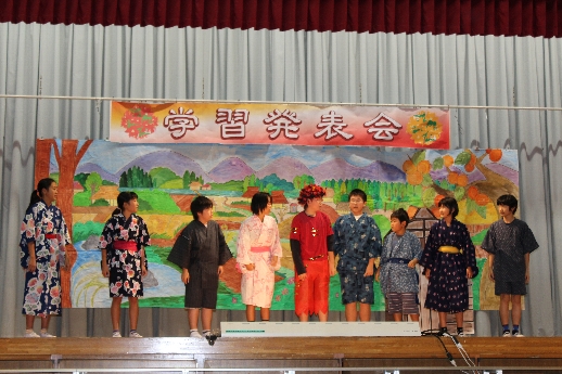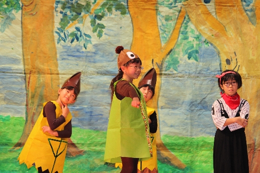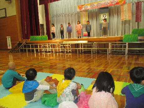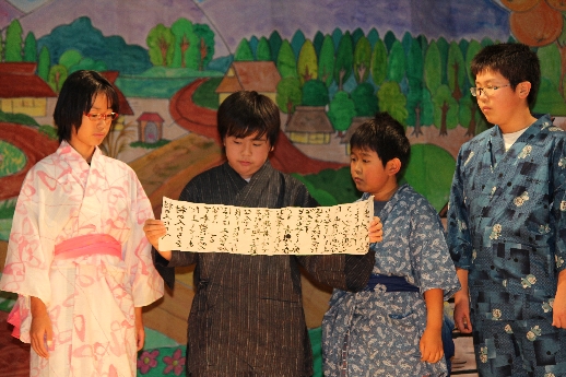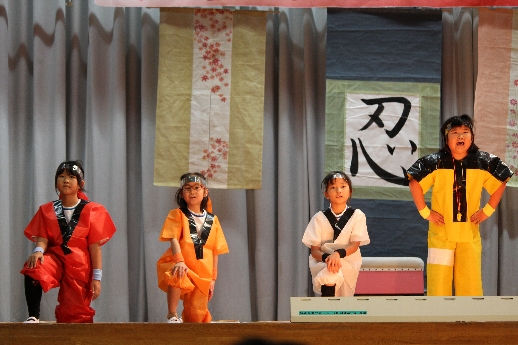 忍者道場のちびっこ忍者の修業を通した物語です。心は優しいけど、試験に合格できなかった「さくら丸」をめぐる心温まる場面が泣かせます。とても長いセリフをしっかりと覚えて堂々と演技する姿はすでに高学年の風格がありました。そのような姿の中にも,2年生のかわいらしさがふんだんに出ていてとても素晴らしい作品に仕上がりました。道場長役でゲスト出演した先生もいい味を出してていました。