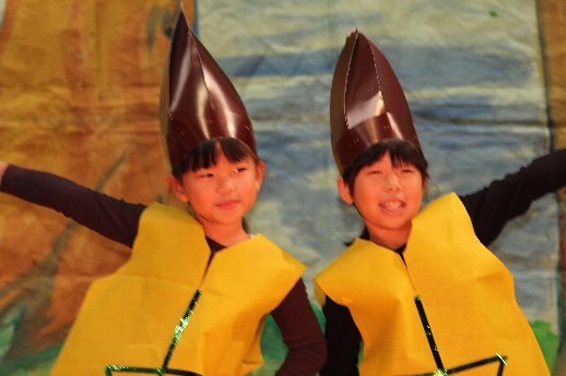 3年生の劇はどんぐりと山ねこ小高4小Ver.です。お互いのよさばかりを主張するドングリたちが栗を仲間にしようとするのですが、その争いに辛い気持ちになってしまった栗の一言でお互いのよさを思い出す物語です。自分たちのよさを表現するパフォーマンスはそれぞれのよさがよく出ていました。犬のおまわりさん役で出演した専科の先生も熱演してていました。観ていたみんなが相手のよさについて考えさせられたのではないでしょうか。