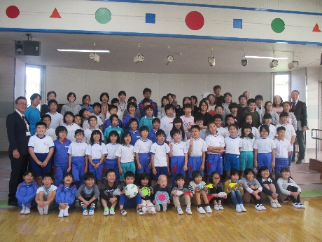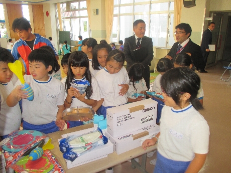 ディズニーランドやディズニーシーを経営しているオリエンタルランド様から多くの支援をいただきました。今回社員の方をお迎えして贈呈式を行いました。ドッジビーやジャベボール、活動量計など楽しみながら体力向上を目指すためのものをたくさんいただきました。