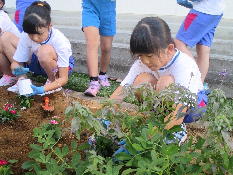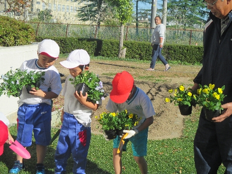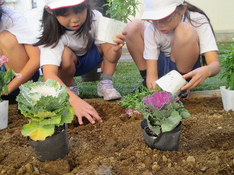 マリーゴールドやサルビアなど、夏の花に元気がなくなってきました。そこで、来年の春に学校が花でいっぱいになるように願いながら栽培活動を行いました。全校児童で学校にあるたくさんの花壇にパンジーやビオラ、葉ボタンなどを移植したりチューリップの球根を植えたりしました。また、恒例の一人一鉢にも取り組んで、一人一人が学校を美しくしていこうという気持ちも育てたいと思います。これから厳しい北風が吹き荒れる季節がやってきますが、厳しい冬を乗り切れるように一生懸命お世話していきたいと思います。