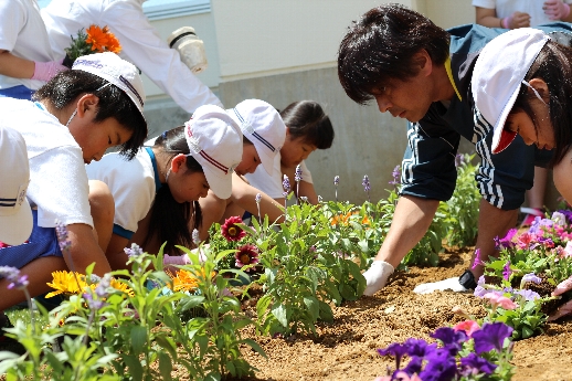 パンジーやチューリップなどの春の花の時期も終わり、夏に向けての花壇づくりを行いました。今年もたくさんの花の苗の支援を受けました。そこで学年ごとに場所を決めて自分たちの手で学校を花いっぱいにする活動を計画しました。一番乗りは4年生、手袋をはめて土を掘りながら植える位置を決めていきました。「赤と紫を互い違いにしようよ」「もっと深く掘った方がいいよ」など楽しくお話をしながら作業を進めていました。力持ち自慢の男子は離れた場所からジョウロに水を汲んできて、たっぷりと植えたばかりの苗に水をかけていました。これからどの学年でも栽培活動を行い、学校を花いっぱいにしていく予定です。お子さんの送迎時などに、花壇にも注目してみてください。