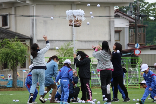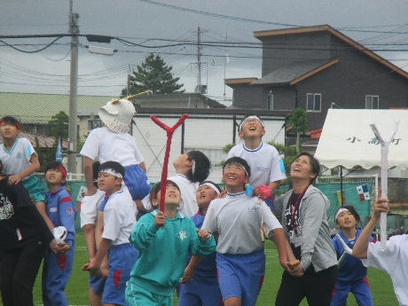 開会式では7名の1年生が元気いっぱいに開会を宣言し、小高区4小学校運動会は始まりました。応援合戦からすでに子ども達の熱気は高まっていき、曇り空も吹っ飛ばしてしまうような感じがしました。校庭を走り、跳び、踊る姿は地域の方々にも笑顔と元気を与えていたようでした。親子競技では子ども以上に張り切って競技に参加しているお家の方々の姿が印象的でした。また、昼食前に行った盆踊りには、今までで一番と思えるような数の地域の方々に参加していただき大変盛り上がりました。
