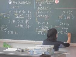 「72+63の計算の仕方を考えること」をテーマに学習していました。子どもたちは「72は70と2」「63は60と3」のように分けてから、「10が7こ分と6こ分で計13個分だから130」「2+3=5」と考え、十の位や一の位に着目して計算していました。
