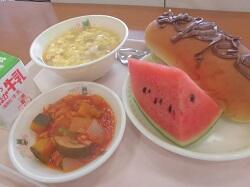 今日の献立は「コッペパン」「牛乳」「だいずチョコクリーム」「ラタトゥイユ」「ふわふわたまごスープ(卵・乳)」「こたますいか」でした。