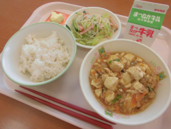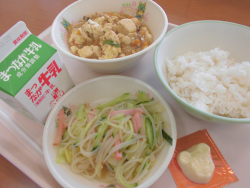 今日の献立は「むぎごはん」「牛乳」「マーボーどうふ」「ちゅうかサラダ」「かたぬきチーズ(乳)」でした。