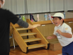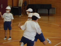 「多様な動きをつくる運動に挑戦すること」をテーマに活動していました。子どもたちはまず、ペアを作って「手押し相撲」に挑戦していました。押すタイミングや力加減、バランスの難しさも実感していました。