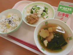 今日の献立は「くりごはん」「牛乳」「とりにくのこうみソーズあえ」「かぶときゅうりのあさづけ」「すましじる(麦)」でした。