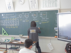 「長さの単位を基にして、面積の単位をまとめること」をテーマに学習していました。子どもたちは、1㎡や100㎡(1アール)、10000㎡(1ヘクタール)、1000000㎡(1㎢)、そして、辺の長さが10倍になると面積は100倍になることもまとめていました。