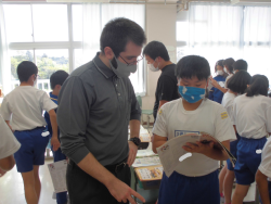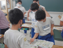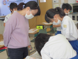 「町の地図を利用して、スタート地点やゴール地点を決めて、目的地を伝え合うこと」をテーマに学習していました。子どもたちは、ペアをつくりながら、伝え合う表現に慣れ親しんでいました。