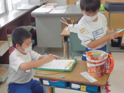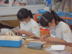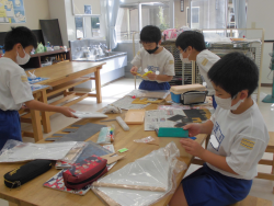 「生活に役立つものを完成させること」をテーマに活動していました。子どもたちは、釘や接着剤でくっつけたり、ひもを付けたりしながら作業を進めていました。