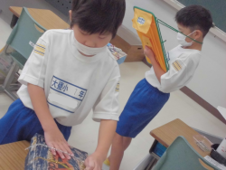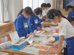 「友達の作品のよいところを見つけること」をテーマに活動していました。子どもたちは、作品を見て感じたことや見つけたよさをカードに記録していました。