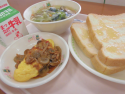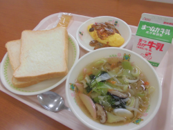 今日の献立は「しょくパン」「牛乳」「けんさんリンゴジャム」「オムレツのカラフルソースかけ(卵)」「やさいスープ」でした。