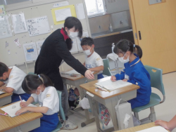 「漢字の同じ部分を見つけて仲間分けすること」をテーマに学習していました。子どもたちは、説明を受けながら、見たり書いたりしながら漢字の仲間分けと練習を行っていました。