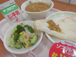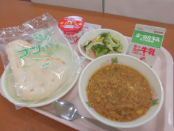 今日の献立は「ナン」「牛乳」「キーマカレー(麦・乳)」「ブロッコリーのサラダ」「ヨーグルト(乳)」でした。