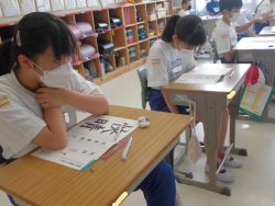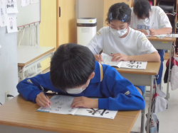 「筆順と点画のつながりに気を付けて書くこと」をテーマに学習していました。子どもたちは、どのように書けばよいか、手本をよく見て考えながら取り組んでいました。