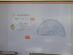 「分度器を使って角度を測ること」をテーマに学習していました。子どもたちはまず、提示された角と分度器から角度の読み方を確認し、その後、測定に挑戦していました。