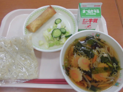 今日の献立は「しょうゆラーメン」「牛乳」「てづくりはるまき(麦)」「キャベツときゅうりのレモンづけ」でした。