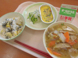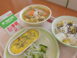 今日の献立は「くりごはん」「牛乳」「ちぐさむし(乳卵)」「こうみあえ」「とんじる」でした。