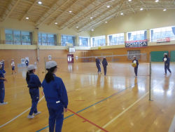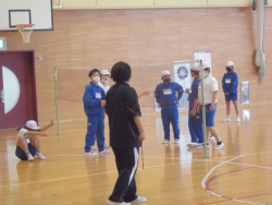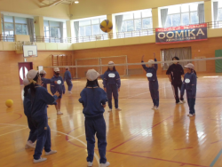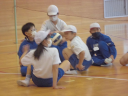 「チームに分かれて、バレーボールのゲームを行うこと」をテーマに活動していました。子どもたちは、ボールを扱う練習をした後に、ルールを確認し、試しのゲームに挑戦していました。