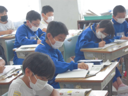 「“とめ・はね・はらい”や“おれ・まがり・そり”に気を付けて書くこと」をテーマに学習していました。子どもたちは、練習ノートの手本を確認しながら、一画一画を丁寧に書いていました。