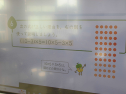 「計算のきまりを見つけること」をテーマに学習していました。子どもたちは、式とその答えから「分配のきまり」を知った後に、図を使って説明することに挑戦していました。