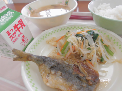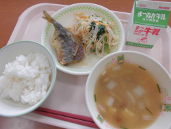 今日の献立は「ごはん」「牛乳」「いわしのかばやき」「あぶらあげのカリカリあえ」「なめこじる」でした。