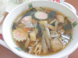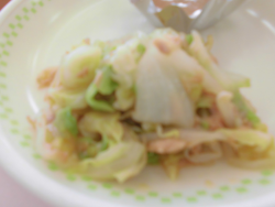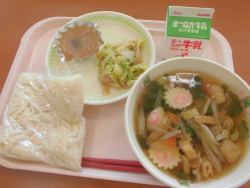 今日の献立は「わかめうどん」「牛乳」「キャベツのツナあえ」「てづくりあんいり ゆべし(麦)」でした。
