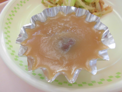 「ゆべし」は、東北から北関東を中心に昔から伝わる郷土の和菓子です。もともとは柚子を使った和菓子が由来で「柚餅子(ゆべし)」と書きます。柚子やくるみの実を使った餅菓子ですが、、全国各地でいろいろな形・味・作り方があるそうです。福島県ではあん入りの「ゆべし」がよく作られています。今日は、調理員の皆さんの“手づくりあんゆべし”です。スチームコンベクションで蒸し上げて作りました。心を込めて一つ一つ手づくりされた郷土和菓子の味は格別でした。