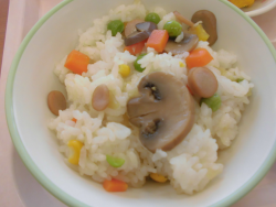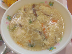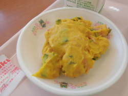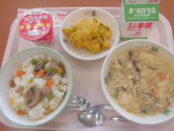 今日の献立は「カラフルごはん」「牛乳」「パンプキンサラダ」「たまごとほうれんそうのスープ(卵)」「ヨーグルト(乳)」でした。