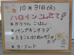 「ハロウィン」は、10月31日に行われるヨーロッパやアメリカ等の国々のお祭りです。秋の収穫をお祝いして祖先の霊をお迎えするとともに、悪霊を追い払う意味合いのある行事です。ハロウィンでよく見かける顔つきのカボチャを「ジャック・オー・ランタン」と言うそうです。お化けカボチャという意味です。悪霊を怖がらせて追い出すために飾るそうです。今日の給食は、ハロウィンにちなんで「パンプキンサラダ」が提供されています。食事からもハロウィンの気分を味わうことができました。
