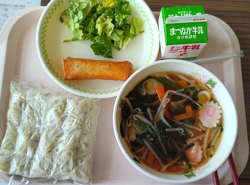 しょう油ラーメン 手作り春巻 グリーンカールレタス添 牛乳