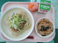 本日の給食は、牛乳、ジャージャーめん、もやしのからしあえ、れいとうみかん、でした。