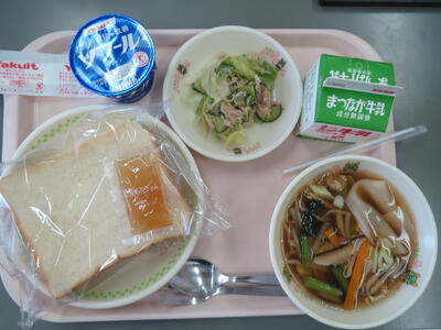 本日の給食は、牛乳、食パン、ももジャム、ツナサラダ、ワンタンスープ、ヨーグルト、でした。