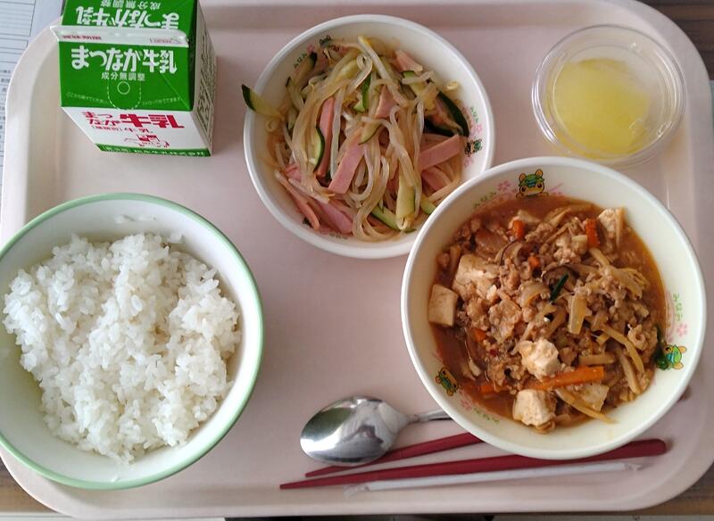 ごはん マーボー豆腐 マロニーサラダ レモンゼリー 牛乳