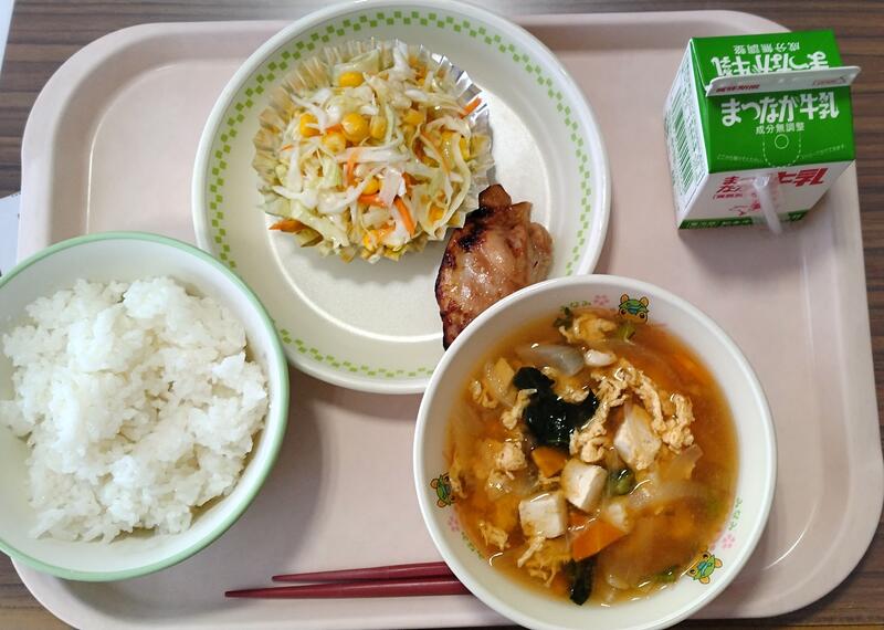 ごはん とりのてりやき コールスローサラダ かきたまみそ汁 牛乳