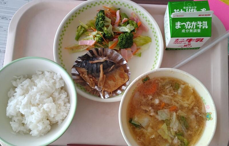 ごはん サバの生姜煮 ブロッコリーサラダ いろいろ野菜と豚肉のスープ 牛乳