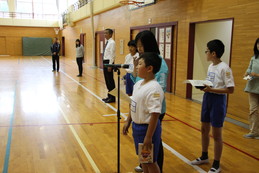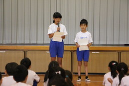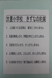 最後に、代表委員会による「大甕小学校 きずなの約束」宣言を行いました。大甕小学校は、児童全員が協力し合い、絆をつくる場所です。お互いを認め合う学校にするためには、いじめの発生を未然に防ぐ必要があり、そのためには、一人一人がいじめを許さない勇気を持つことが大切です。以上のことから、代表委員会がリーダーシップを発揮して、全校生と確かめ合いました。