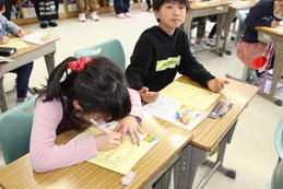 2年生は、道徳。授業の終末には、お家の人に、ありがとうの手紙を書きました。