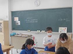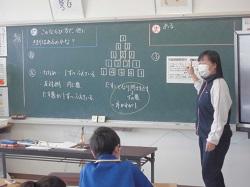 ピラミッド型8段に記された数字から、「並び方やその他のきまりがあるのかを探る活動」「きまりから数字を書きこむ活動」を行っていました。「ななめに見ると…」「反対側を見ると…」「たしてみると…」子どもたちは学習のまとめや振り返りの場面で、見つけた決まりや感想等をしっかり発表していました。