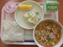 今日の献立は「きつねうどん」「おからサラダ」「みしょうかん」「おいわいゼリー」でした。