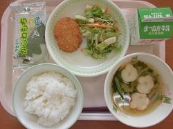 今日の献立は「ごはん」「ポークコロッケ(麦)」「みずなサラダ」「わかめのみそしる(麦)」「かしわもち(麦)」でした。※12日(火)~22日(金)は対応給食となり、献立変更となる場合もあります。