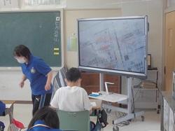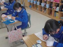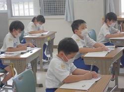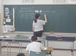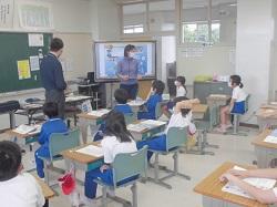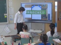 「習字道具の扱い方や毛筆活動の準備の仕方を知ること」をテーマに活動していました。子どもたちは、電子黒板の画面を見ながら説明を受け、自分の机の上の準備を進めていました。これからの活動も楽しみです。
