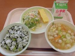 今日の献立は「グリンピースごはん」「牛乳」「あつやきたまご(卵)」「だいこんとみずなのサラダ」「キャベツのみそしる(麦)」でした。