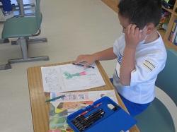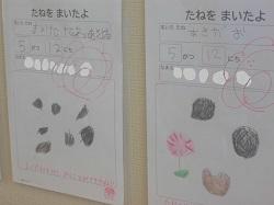 「アサガオの花の生長の様子を伝えるための観察記録をまとめること」をテーマに活動していました。子どもたちは、5月12日(火)時点の種の様子から、その後の様子を絵と言葉で記録していました。