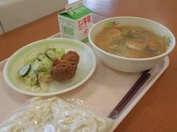 今日の献立は「とりなんばんうどん」「牛乳」「ツナサラダ」「サーターアンダギー」でした。