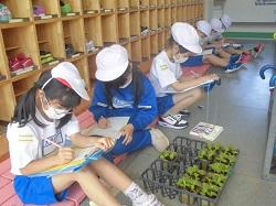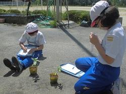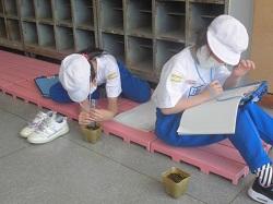 「植物の成長の様子を観察し記録すること」をテーマに学習していました。植物はヘチマやホウセンカ、ヒマワリ、オクラです。子どもたちは、葉やくきの大きさ(長さ)・色・形を観察し、ていねいに記録していました。終了後は満足の表情も見られました。