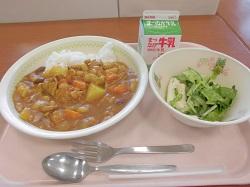 今日の献立は「ごはん」「ビーンズカレー」「牛乳」「イカとみずなのサラダ」でした。