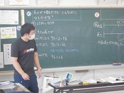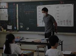 「長さが小数のとき、1mの値段を求める式はどうなるかを考えること」をテーマに学習していました。子どもたちは、2mや3mの場合の簡易な数字を用いて考え、長さが小数でも値段を求める式はわり算になることをまとめていました。